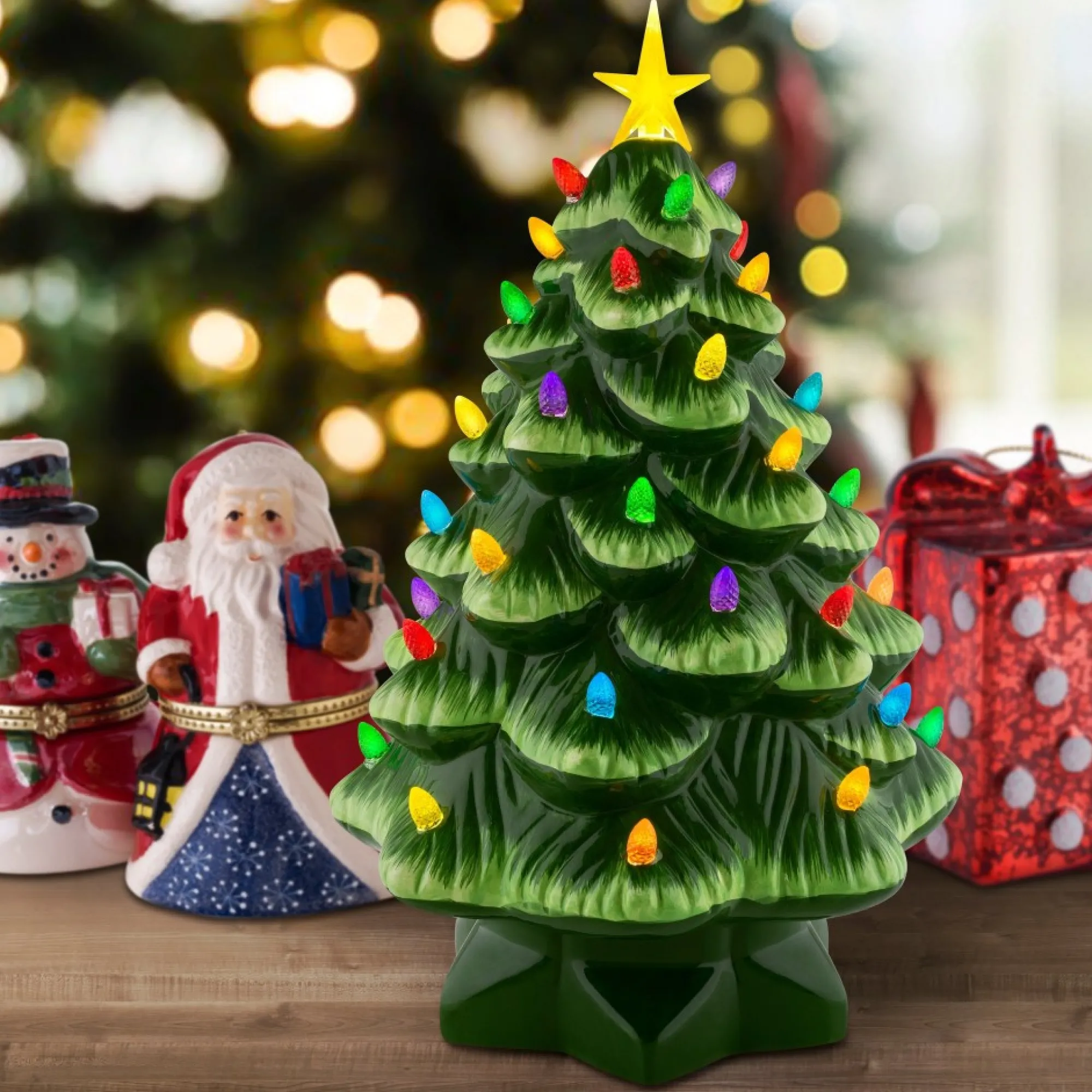 Bring Back Memories From Christmas Past With This Vintage-Inspired Ceramic 14″ Nostalgic Christmas Tree By Mr. Christmas. This Classic Christmas Decoration Has Been A Focal Point Of Households For Generations, Now Available With Modern Technology. Led Lights Radiate Through The Faceted Bulbs, And A Bright Yellow Star Illuminates The Top Of The Tree With A Shiny Polished Green Finish. A Four-Hour Timer Saves Battery Life And Makes The Tree A Perfect Nightlight. Operates On 3 X “C” Batteries (Not Included), No Cords To Worry About, And Easy Setup. This Tree Looks Great On The Mantel, Side Table, Bedroom, Bookshelf, Or Anywhere That Needs A Festive Touch. The Mr. Christmas Nostalgic Christmas Tree Makes The Perfect Gift For Your Loved Ones Or Yourself, Especially If You Can’T Make It Home For The Holidays.